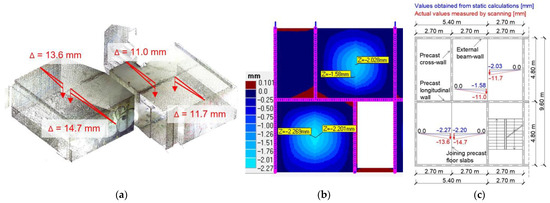 Verification of slab displacements above the ground floor: (a) reading of deflections from point cloud; (b) deflections from dead weight based on numerical calculations; (c) comparison of actual deflection values with the theoretical values.