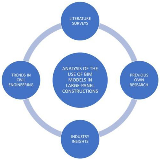 In order to determine the suitability of parametric models for the management of large-panel buildings, the authors conducted extensive research into BIM technology and systemic prefabricated buildings. The research included literature studies, tracking of current trends in the civil engineering sector, industry insights from construction experts and a large amount of our own research on systemic prefabricated buildings [4,5,9,10]. The authors verified the results of their research carried out using various methods. The verification was carried out on the example of detailed condition analyses of more than 100 buildings located across the country in 6 out of 16 provinces in Poland. For example, in the province of Mazovia, more than 100 buildings were examined [3,12]. The subsequent research presented in this article contributes to the development of a research methodology for large-panel buildings. A research methodology related to the feasibility of using BIM technology in large-panel facilities is presented in Figure 7.