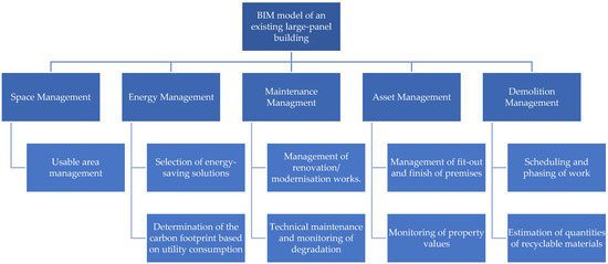 In the large majority of cases, facility management using a BIM model is limited to facilities that were designed using this technology, and the model was already present from the concept stage. In practice, the use of BIM for existing buildings that were not designed using the parameter model is focused on facilities of high cultural value (heritage buildings) or of great economic importance (industrial, infrastructure facilities). Given the number of large-panel structures, it makes sense to introduce solutions that can contribute to improving the efficiency of management at each stage of the life of the building.