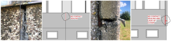The gable walls of the large-panel buildings in the regional OWT system were made as prefabricated, three-layer walls. The inner layer was a 14 cm thick reinforced concrete bearing wall, followed by a 5–6 cm thick polystyrene insulation layer. The facade layer was made of 5–6 cm thick reinforced concrete, which had an architectural function. The critical points of the facade were the horizontal and vertical joints of the panels. These joints, in the case of improper installation or inadequate sealing, are places through which moisture penetrates the building [12]. This degrades the structural elements and can lead to the growth of fungi and mould in the flats. According to the design guidelines, the external vertical contact should have a width of no more than 20 mm. The joints along their entire length should be sealed with sealing putty, and the insulation layer was to be protected from the inside with bitumen felt. A steel hood with aluminium sheeting was also supposed to protect against water penetration. The detail of the joint sealing is shown in Figure 3a.