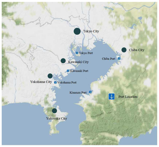 The scope of this study area is the port of the Tokyo Bay Area (Figure 2). Tokyo Bay is a standard breeding ground for good natural harbors, and its narrow mouth and wide bay make it the best place for ports to gather. From the mouth of the Sumida River at the top of the bay, six major ports have been formed on the west and east coasts, namely, the ports of Tokyo, Kawasaki, Yokohama and Yokosuka on the west coast, and the ports of Chiba and Yokosuka on the east coast. This led to the formation of what would become known as the Keihin and Keiyo industrial zones.