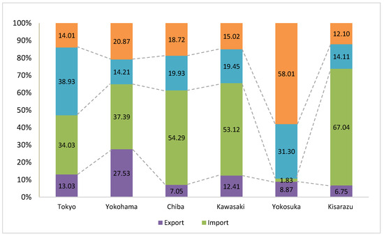 Comparison of the breakdown of the six major port transportation types in Tokyo Bay, 2015 Source: authors’ own drawing.(data source: Tokyo Metropolitan Port Bureau official website (www.kouwan.metro.tokyo.jp (accessed on 27 May 2017), Kawasaki Port Statistical Yearbook (www.city.kawasaki.jp (accessed on 27 May 2017), Yokohama City Harbor Bureau official website (www.city.yokohama.lg.jp (accessed on 27 May 2017), the official website of Chiba Prefecture (www.pref.chiba.lg.jp (accessed on 27 May 2017), Yokosuka City official website (www.city.yokosuka.kanagawa.jp (accessed on 27 May 2017).