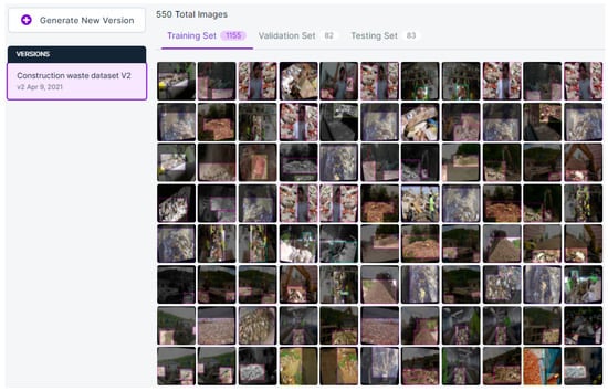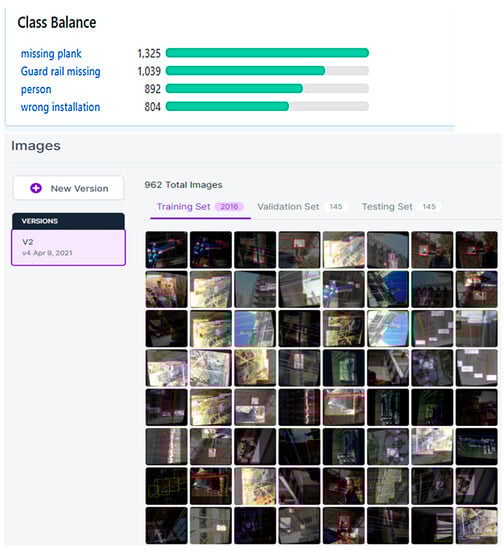 A total of four datasets, named scaffold checking dataset, construction waste dataset, mobile scaffolding dataset, and rebar dataset, were generated and utilized to train and validate the CV-based systems for safety compliance checking before work, during work, with intervals, and after work, respectively. Image augmentation techniques, including rotation, crop, shear, hue, saturation, brightness, exposure, and blur, were applied to the training set of Dataset A, Dataset B, and Dataset D to prevent overfitting and the dataset was pre-processed and labeled using the Roboflow platform. However, Dataset C was used from the previous research [], and the augmentation techniques used for that dataset are mentioned in Section 4.3. The details of these datasets are as follows: