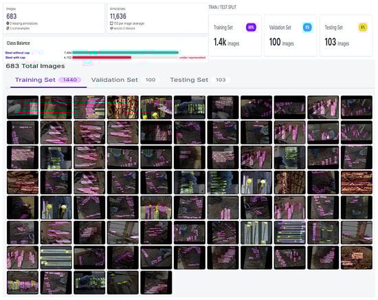 The authors addressed the lack of a construction steel rebar dataset by creating one based on OSHA safety rules. They used various keywords to collect 849 raw images from Google and YouTube, resulting in a final dataset of 683 images. The dataset was split into training, validation, and testing sets in a 70:15:15 ratio and labeled with two classes: steel with cap and steel without cap using the Roboflow platform. A total of 11,636 annotations were labeled, averaging 17 per image. After augmentation, the training dataset increased to 1440 images, while validation and testing datasets remained the same. Figure 3 shows the health check visualization of the dataset.