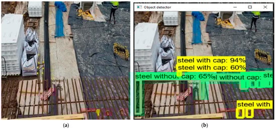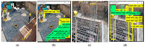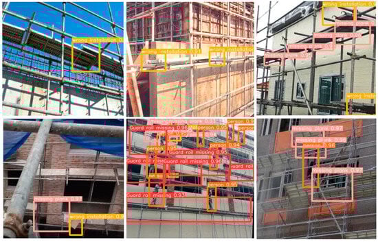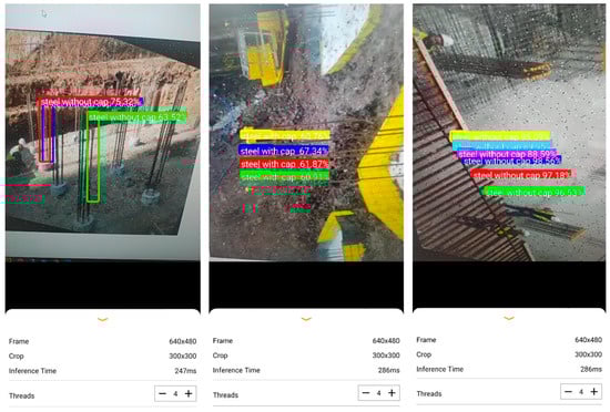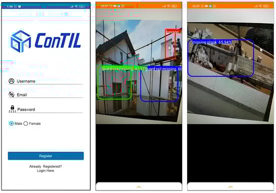 Following the conversion of the best-fit model to a TFLite model, an integrated development environment is utilized to build the visible defect detection system for scaffolds on embedded edge computers. The application is developed based on an open-source framework cloned from the GitHub repository [], with a TensorFlow back-end. Essential modifications have been made to both the back-end and front-end of the extracted open-source framework. In the back-end, the system records real-time data on visible unsafe conditions in the scaffolding system, such as missing guardrails, wrong plank installation, and missing planks. This data is stored in a Firebase database. Additionally, a user interface for login has been implemented in the front-end to authenticate users. The downloaded trained model with metadata is embedded within the application framework. To ensure functionality and reliability, the developed application is tested using a virtual smartphone (a built-in function of Android Studio) before deploying it to embedded devices. Once the virtual test is successfully conducted, the application is deployed on a Xiaomi Redmi Note 8. Figure 6 showcases examples of results obtained through edge computing and the user interface.