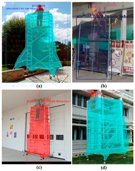 A large amount of labeled digital data is required to train a deep learning-based classifier. Therefore, the dataset used in the previous study was employed to validate this group of studies []. A total of 938 images were used as the starting point for the experimentation. These 938 images in the database were divided into training and validation sets in a 75:25 ratio, with 75% of the images used to train the model and validate the model during training and 25% used to test the model’s precision and accuracy. During each training iteration, data augmentation techniques were applied using five strategies to optimize the performance of the trained network and prevent overfitting. The training images obtained with the VGG annotator were augmented with Gaussian blur, affine transformations, and contrast normalization to reduce the storage space required for the training set. Three classes were defined to recognize unsafe behavior: (1) ‘scaffold’ for mobile scaffolding without outriggers, (2) ‘safescaffold’ for mobile scaffolding equipped with outriggers, and (3) ‘person’ for a worker.