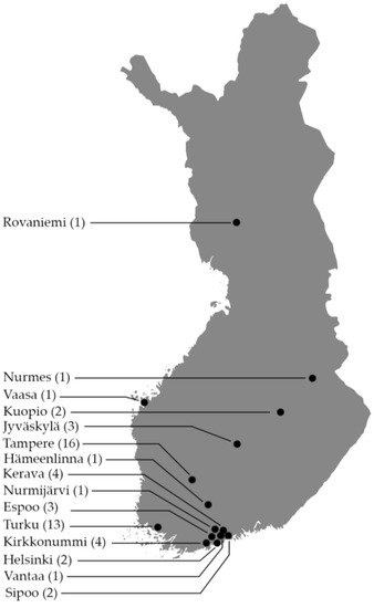 47]. The cases were 55 mid-rise timber apartment buildings from a variety of Finnish municipalities (sixteen in Tampere, thirteen in Turku, two in Kuopio, four in Kirkkonummi, three in Espoo, three in Jyväskylä, four in Kerava, two in Helsinki, two in Sipoo, one in Vaasa, one in Hämeenlinna, one in Nurmes, one in Nurmijärvi, one in Rovaniemi, and one in Vantaa), as shown in