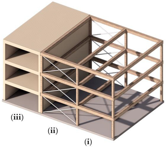 Structural materials can be grouped as (1) timber and (2) composite/hybrid, such as timber + (reinforced) concrete, timber + steel, or timber + (reinforced concrete) + steel. In this context, this article has considered primary load-bearing components, such as columns, beams, shear trusses, and shear walls, excluding floor slabs. Furthermore, the material composition of the load-bearing structures on the first floor does not alter the categorization of the structural system or the definitions of the construction methods outlined below.