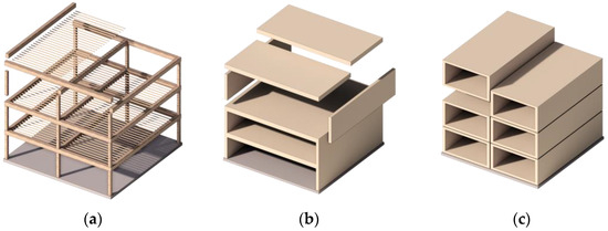 Figure 6b,c,e,g). This, combined with the significant influence of party walls on space efficiency due to their repeated presence throughout the building, could potentially account for the finding that the use of different timber materials does not result in a significant difference in the average ratios of structural wall area to gross floor area, as demonstrated in