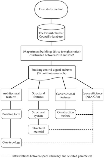 In the scope of this paper, four key points were addressed to examine the important features and their interrelations to space efficiency in Finnish mid-rise timber apartment construction: (1) general information (building name, location, height, number of stories, and completion date), (2) key features having an effect on space efficiency (load-bearing system, construction method, structural materials, building form, and core design), (3) space efficiency, and (4) the interrelationship of space efficiency and key planning parameters. To understand the space efficiency along with the relevant parameters for the planning and construction of mid-rise wooden apartment projects in the Finnish context, the research questions were determined as follows: