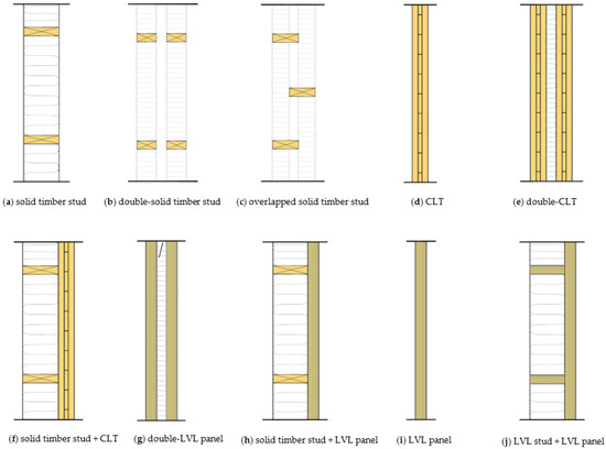 61], which might explain the high prevalence of them among the case studies. Solid timber studs (i.e., lightweight timber frame) were mostly utilized among the case studies, followed by CLT.