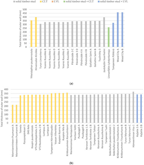 Figure 7b). In this particular case, the outer wall was constructed solely using CLT and had a thickness of 215 mm without the inclusion of any additional insulation layers.