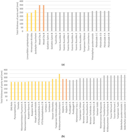 Figure 9b shows that cases constructed using the 3D volumetric construction method exhibit numerous instances where the corridor wall thickness falls below 200 mm. In the case of the Toimela building, where CLT was utilized, the corridor wall had a thickness of 110 mm. In contrast, cases built with the 2D construction method typically have walls measuring around 250 mm (