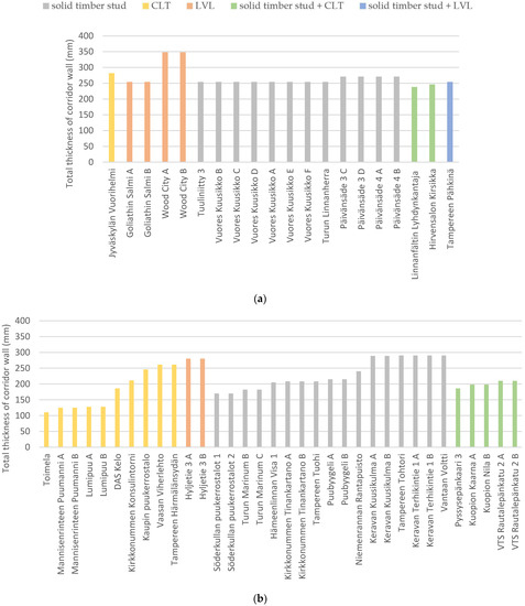 Figure 9 illustrate the total thicknesses of the typical outer, party, and corridor walls in the case studies, respectively. To broaden the scope of the comparison among various timber materials,