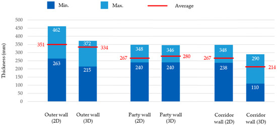 In case studies utilizing the 2D panel construction method, the average thickness of typical outer walls and corridor walls was higher. On the other hand, in case studies employing the 3D volumetric construction method, the average thickness of typical party walls was greater (