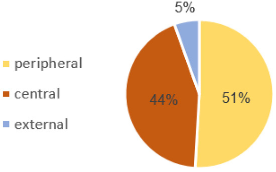 Figure 11, the most dominant core type was the peripheral core (>50%). In most cases, the building depth was narrow, with the core in the peripheral area adjacent to the building envelope, providing an efficient floor plan, which may explain the dominance of the peripheral core. Among the case buildings, the central core was mostly used in squarish floor plans. The central core enables the placing of apartments at the periphery of the building, with more light and views, and the central core often enables shorter fire escape routes, which may have contributed to the high prevalence of this typology.