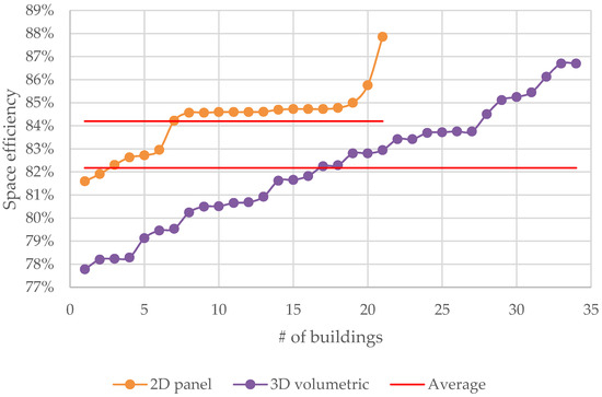 Figure 13 displays a set of markers symbolizing the case buildings, organized in ascending order based on their space efficiency. The average space efficiency in 2D panel and 3D volumetric projects were 84.2% and 82.6%, respectively.
