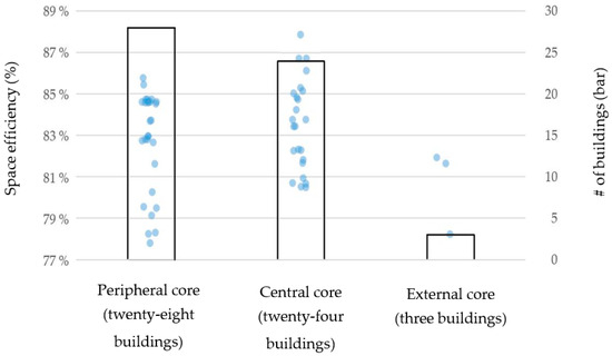 The best average space efficiency was achieved with the central core type, followed by peripheral core arrangement.