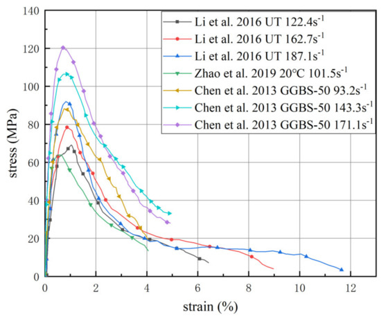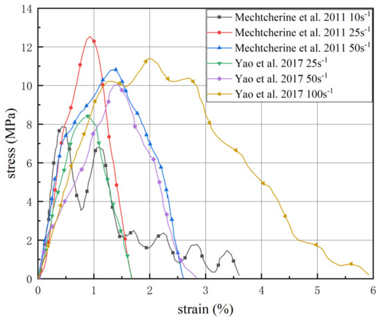 Compressive stress–strain curves under different strain rates [30,31,33].