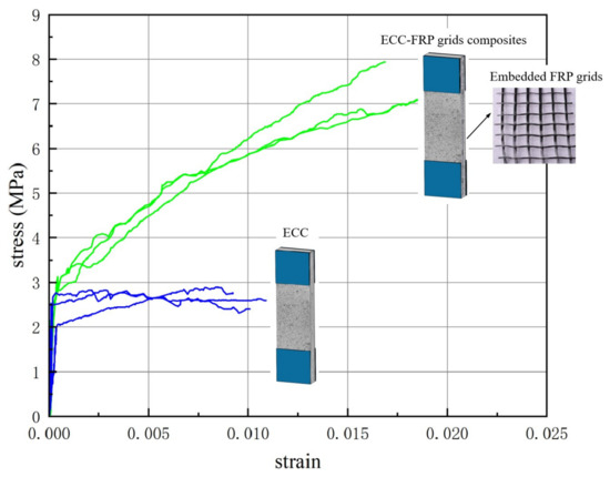 Although ECC exhibits much higher tensile toughness than normal concrete, its tensile strength is comparable to that of normal concrete. Considering scenarios involving impact or seismic events that demand both toughness and strength, researchers have explored ECC–FRP grid composites. These composites can achieve a highly collaborative effect in terms of tensile strength, toughness, energy dissipation, and crack control [25]. The common approach involves embedding FRP grids into ECC, where ECC can provide excellent crack resistance and compressive strength, and FRP contributes a high tensile property and stiffness to the material. Numerous studies have demonstrated that the tensile performance of the composite material with embedded FRP grids is significantly improved compared to the tensile strength of unembedded ECC [23,24,25,54], as depicted in Figure 3 (experimental date from ref. [55]). However, the ultimate tensile strain remains inconclusive across various research studies.