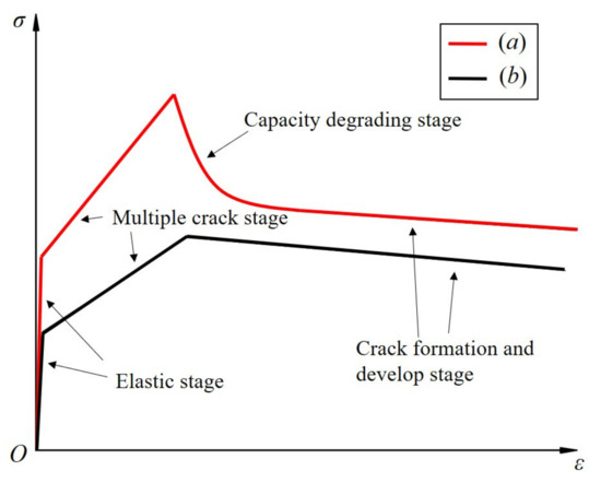 Similarly, the choice of fiber type in ECC has a significant effect on the performance of the composites. All studies in the last paragraph focused on the PVA–ECC matrix. The stress–strain curve can generally be divided into two stages: the elastic stage and the multi-crack development stage. The composite material enters the second stage after the cracking of ECC. In this stage, the cracks start to increase and develop until the specimen is pulled off and broken, which can be simplified as in Figure 4. Li et al. [24] utilized three different weaves of BFRP grids to embed UHDCC (PE fibers). The authors found that the stress–strain curve was different from the study of Deng et al. [54]. After undergoing the elastic stage and multi-crack development stage, there were two different development patterns according to the volume ratio of the added BFRP grids. When the grid volume ratio was greater than 1%, the tensile stress decreased sharply in the third stage, and progressive ruptures of fiber rupture occurred, but a larger crack had not yet been observed. Until the sudden rupture of FRP, the material enters the fourth stage, when the stress is relatively stable and the strain continues to increase until finally the PE fibers rupture or pull out, and part of the woven threads of FRP also pulled out, forming a large crack and entering the softening stage before failure (Figure 5a). On the other hand, when the volume ratio of the FRP grid was less than 1%, the reinforcement degree was not high in the second stage. After the end parts of the FRP woven threads ruptured, the stress–strain curve directly entered the stress stabilization stage, finally forming a large crack and entering the softening stage before failure (Figure 5b). Gong et al. [25] wrapped styrene-butadiene impregnation yarns and polyacrylate impregnation yarns on CFRP, respectively. The PE-SHCC and as-spun poly(p-phenylene-2,6-benzobisoxazole) (PBO-AS) fibers SHCC (PBO-AS-SHCC) were then strengthened with these two CFRPs, both grids having a volume ratio of 2%. The stress–strain curve close to that of Figure 5a was also observed on the specimens with lower strength CFRP grid-reinforced PE-SHCC, while the two-stage curve of Figure 4 was still observed when the CFRP grid strength was higher. Therefore, it can be concluded that the tensile stress–strain curve of the composite material may be related to the toughness of the fibers, the interfacial bonding performance with the matrix, and the bridging performance. When the FRP gradually ruptures and fails, if the fibers in the ECC have not completely ruptured or been pulled out, the ECC still has the capability to bear the tensile stress, and the strain-hardening behavior is observed in the form of platform segments on the curve.
