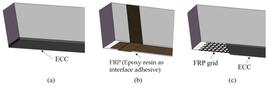 Three strengthening systems: (a) member strengthened with ECC; (b) member strengthened with FRP; (c) member strengthened with ECC–FRP.