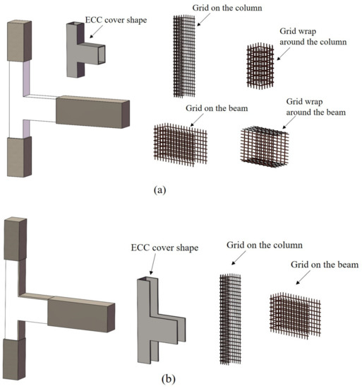 Schematic drawing of “W” and “S” type joint retrofit: (a) Schematic drawing of type “W” retrofitting specimen with CFRP grid configuration; (b) schematic drawing of type “S” retrofitting specimen with CFRP grid configuration [82].