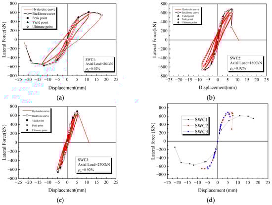 - Shear failure was observed in all members. After concrete crush and spalling occurred in the shear-compression zone, the squat walls failed due to the out-of-plane buckling. No obvious pinch effect was observed in the hysteresis curve of specimens, owing to the little bond slip under high axial load;