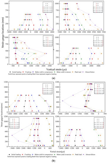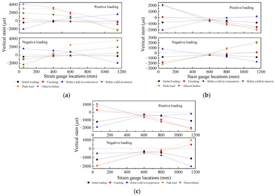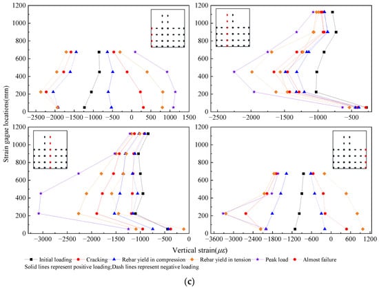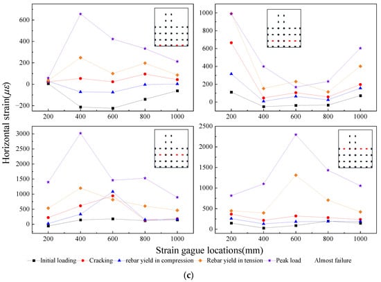 - As depicted in the Figure 5c, 3-mm-width strain gauges were attached in the cavities. The spacing of the strain gauges for the longitudinal and transverse reinforcement were 225 mm and 200 mm, respectively;