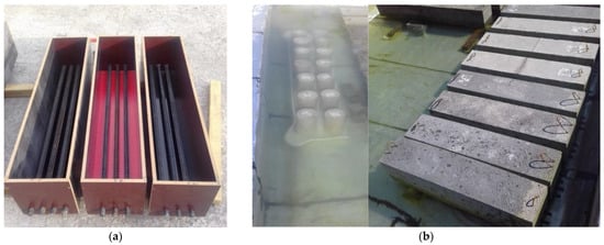 Preparation of the HC beams: (a) formwork and rebars, (b) curing specimens, and (c) final specimens.