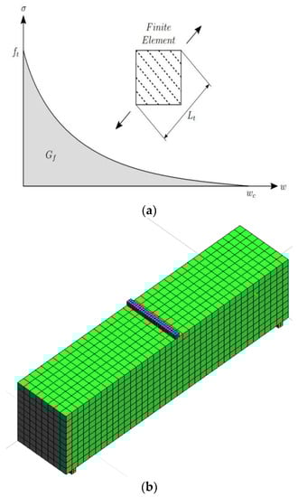 where is the fracture strain; is the crack width; and as illustrated in Figure 11a, which is accompanied by a 3D view of the beam in Figure 11b, distinct mesh sizes in Figure 11c, and the tensile function in Figure 11d. The procedure for simulating the behavior of fiber-reinforced composites is outlined below: