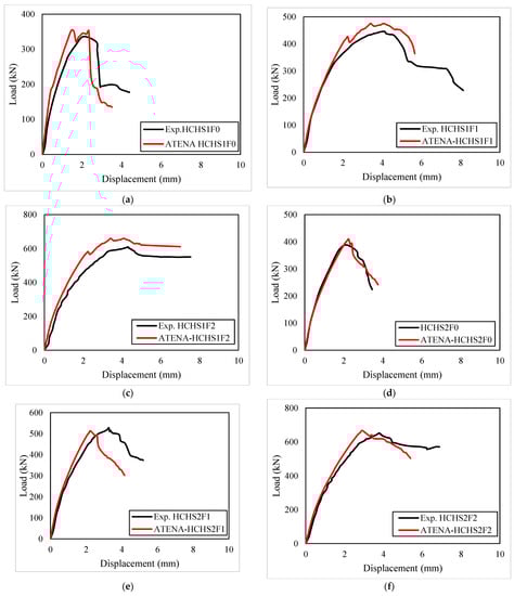 One of the most noteworthy instances of overestimation in the realm of research is found in the work of Padmarajaiah and Ramaswamy []. Their estimates excessively inflate the response of both plain and fibrous concrete. This overestimation ranges from a minimum of 48% for the HCHS2F2 specimen to a maximum of 90% for the HCHS2F0 specimen [,,]. Similar trends are observed in the studies by Khuntia et al. [] and Russo et al. [].