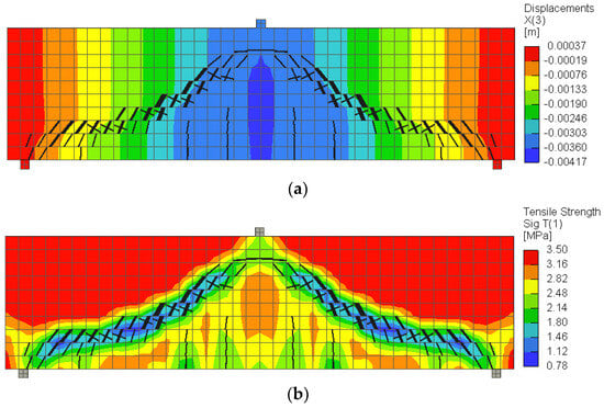 A comparison of the experimental and numerical load-deflection curves in Figure 12 shows that ATENA [] is capable of capturing the shear behavior of fiber-reinforced HC beams successfully with a good margin of error. This finding is further validated by the cracking pattern presented in Figure 13, which obviously shows the shear failure of beams. It can also be seen in Figure 12b that the tensile strength is lost along the cracking path, which proves the shear failure induced by diagonal tensile stress. In addition, Figure 13c shows the width of the main cracks along the failure path and Figure 13d reveals that prior to yielding longitudinal rebars, the concrete has failed to perform, which signifies brittle failure (for brevity and similarity, only the results for one specimen were presented).