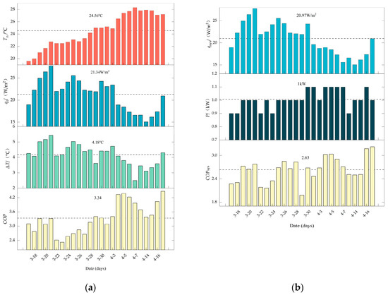 Figure 6b describes the system performance of the ASHP unit. Changes of the indices, such as the heating capacity per square meter of the system (qsys), the heating performance efficient of the heat pump system (COPsys), and the power input of the water pump (P), were analyzed. During the heating season, the mean qsys reached up to 20.97 W/m2, the mean COPsys was 2.63, and the mean power input of the water pump was 1.0 kW. As shown in Table 5, by conducting the relative uncertainty analysis, the relative uncertainty of the calculated q0, COP, qsys, and COPsys were 3.7%, 4.3%, 3.8%, and 4.6%, respectively. These small uncertainty values revealed that the indirect errors were greatly eliminated, and the results calculated were reliable.