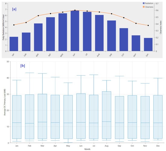 (a) Average global solar radiation and (b) average DC primary load demand.