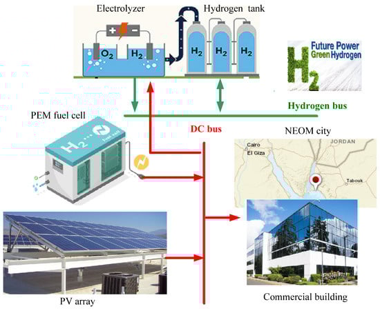 DC power may be more efficient than AC power in certain applications, especially when it comes to local generation and storage. This is because AC power requires extra equipment to convert it to DC power, which can lead to energy losses. Using DC power, on the other hand, makes it easier for devices to use it directly, resulting in higher energy efficiency. Additionally, using DC power can reduce equipment capital costs as it eliminates the need for additional AC–DC conversion equipment. Finally, DC power systems can offer new communication capabilities, including plug-and-play for generation and storage devices, making it simpler to integrate these systems into existing infrastructure. This paper analyzes the optimal size of a photovoltaic/PEM fuel cell system to supply a certain DC commercial load in NEOM city. To identify the best size of the PV/PEMFC, minimizing the cost of energy (COE) and minimizing the net present cost (NPC) are considered. The paper studies three sizes of PEMFCs: 15 kW, 20 kW, and 25 kW. In addition, five different PV modules are selected: Axitec 450 Watt, Jinko 415 Watt, REC Solar 410 Watt, Seraphim 310 Watt, and Tongwei 415 Watt. The results of the study confirmed that the best size of the hybrid system comprises a 15 kW PEMFC, a 267 kW Tongwei PV array, a 60 kg electrolyzer, and a 20 kg hydrogen tank. Under these conditions, the COE and NPC are 0.293 USD/kWh and 498,984 USD, respectively.