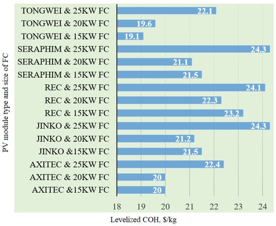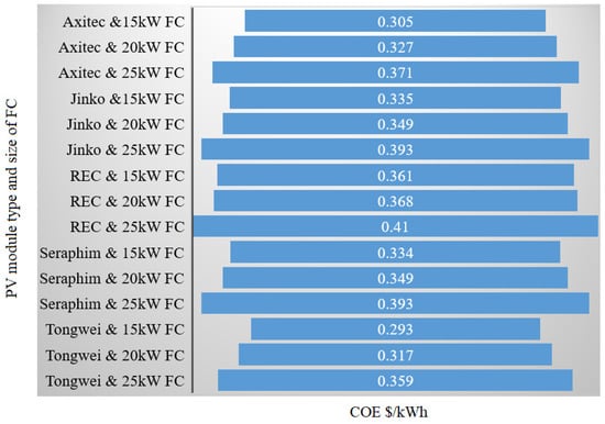 HOMER allows you to identify the best size and layout for the system. The program takes into account energy requirements, available resources, and financial constraints to identify the cost-effective feasible solution that reduces the system’s NPC or COE. This is accomplished through the methodical assessment of different system settings, equipment sizes, usage patterns, and distribution approaches. The HOMER iterative optimization process involves changing variables and evaluating scenarios in order to identify the most efficient solution. In order to identify the best size of PV/PEMFC, three sizes of PEMFC (15 kW, 20 kW, and 25 kW) were considered. Also, five PV panels were used: Axitec 450 Watt, Jinko 415 Watt, REC Solar 410 Watt, Seraphim 310 Watt, and Tongwei 415 Watt. Table 2 demonstrates the optimized results using different PV module types and sizes of FC. The COE values range from 0.293 USD/kWh to 0.41 USD/kWh, and the NPC values range from 498,984 USD to 69,679 USD, depending on the size of the FC and the type of PV module. Ultimately, the best size of FC was determined to be 15 kW. Figure 4 presents the COE with varying the size of FC and the type of PV module. It was found that the Tongwei 415 Watt panel combined with 15 kW of FC yielded the lowest COE of 0.293 USD/kWh, followed by Axitec 450 Watt with the same size of FC. The worst COE of 0.41 USD/kWh was obtained using REC Solar 410 Watt.
