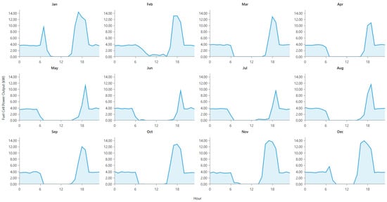 Table 4 presents details on the electrical energy of a PV/PEMFC that uses a 15-kW PEMFC. When the Tongwei 415 Watt is used, the total annual energy production is 380,180 kWh. The PV array generates 92.8% of this energy, while the fuel cell produces the remaining 7.23%. The PV array has an average power output of 40.3 kW and generates 699 kWh of electricity daily. Its capacity factor is 14.6%, and it operates for 4277 h each year. Using the Tongwei module reduces the levelized cost of energy by 32.38% compared to using a REC Solar 410 Watt solar PV module, lowering it from USD 0.0633/kWh to USD 0.0428/kWh. Figure 5 illustrates the mean PV power output over time, with annual maximum outputs of 215 kW and 141 kW being recorded in March and December, respectively. The fuel cell operates for 5426 h each year and has 406 starts/yr. Its expected operational life and capacity factor are 7.37 years and 20%, respectively. Figure 6 shows the hourly output power of the PEMFC, with a mean electrical output of 5.06 kW.