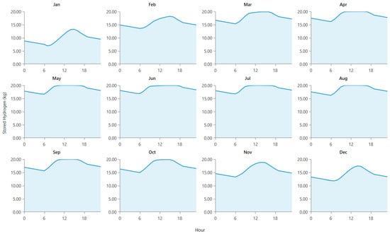 The levelized costs of hydrogen values, shown in Figure 7, range between USD 19.1/kg and USD 24.3/kg. When using a Tongwei 415 Watt with 15 kW, there was a 21.4% decrease in cost compared to a Jinko 415 Watt with 25 kW. As presented in Figure 8, on average, the monthly amount of stored hydrogen is higher when using a Trina solar TSM-430NEG9R.28 with a 30 kW FC. The daily average stored hydrogen ranges between 9.76 kg and 18.79 kg, with the lowest value of 9.76 kg stored in January and the highest value of 18.79 kg stored in June. Figure 9 shows the hourly stored hydrogen.