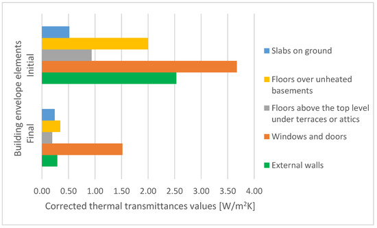 The average values for the thermal transmittances of the buildings’ envelope elements, considering the thermal bridges effect, are centralized in Figure 3.