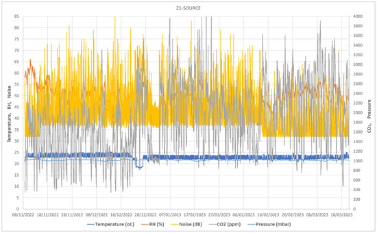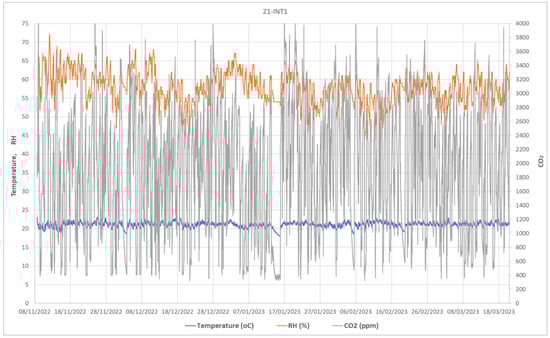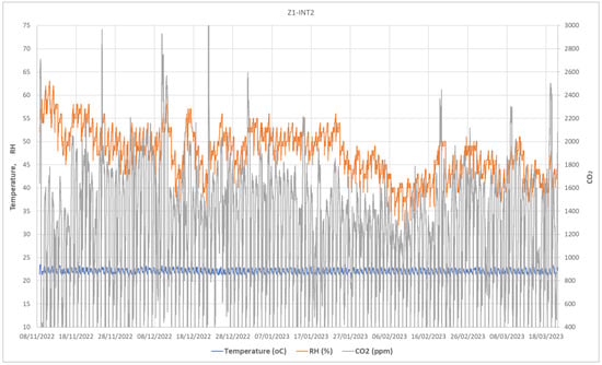 In the current study, special focus was given to the CO2 level analysis, considering the microclimate perspective. In Figure 4, Figure 5 and Figure 6, profiles of measured parameters are presented for several selected cases, i.e., different rooms, for the period from 8 November 2022 to 20 March 2023.