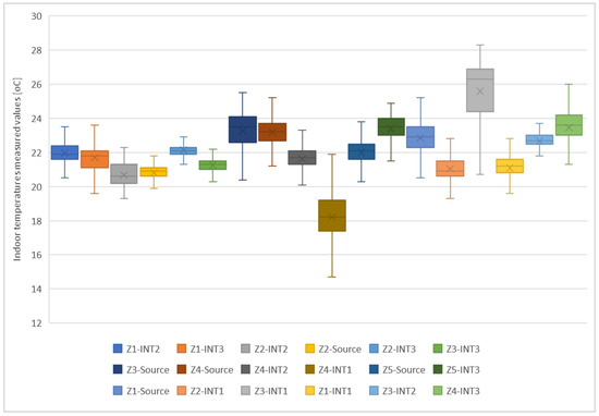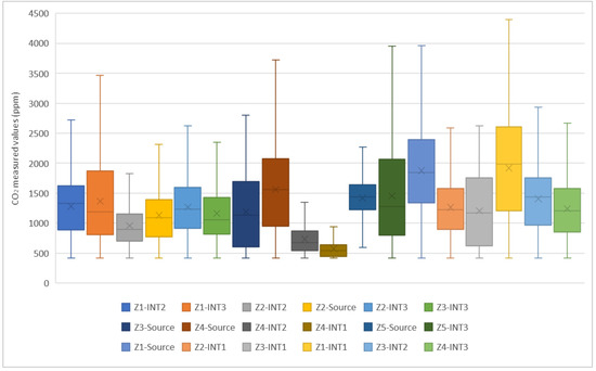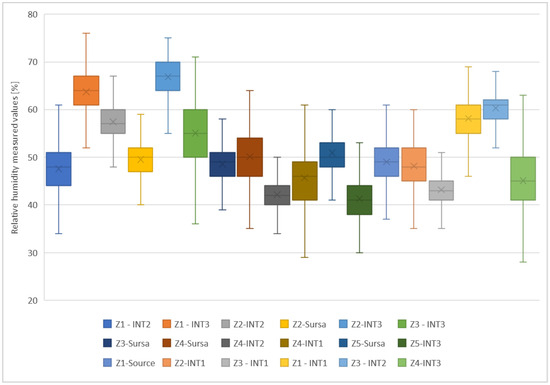 In Figure 7, Figure 8 and Figure 9 the results of the measurements for CO2 level, temperatures and relative humidity (three datasets for each of the 18 modules) are graphically presented, with the following interpretation for each dataset: the minimum value is on the bottom of the whisker/vertical line; the first quartile (Q1) is on the bottom of the box; the median value is on the horizontal line inside the box; the average value is on the “x” inside the box; the third quartile (Q3) is on the top of the box; and the maximum value is on the top of the whisker/vertical line. Considering the type of analyzed information, the outliers were neglected within the graphical representation. Over 2 million recorded values (3 × 18 × the median of 37,704 values for each measured parameter) are graphically represented within the three figures.