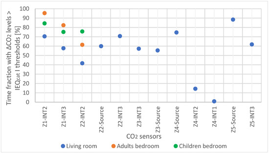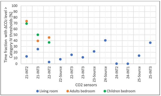 Considering IEQcat IV, which corresponds to a lower comfort threshold, but no additional health risk, the values were as follows: for the bedrooms, the threshold ΔCO2 concentration equals 950 ppm (above outdoors); for the living rooms, the ΔCO2 concentration equals 1350 ppm (above outdoors). Notably, for the bedrooms, the time fraction for which the threshold values were exceeded was still significant (median values of 45.37% for the adults’ bedrooms and 50.14% for the children’s bedrooms). Basically, for almost half of the time, the bedrooms did not provide a health-safe indoor environment for the occupants, due to inadequate ventilation, with the measured indicators being above the health threshold values. For the living rooms, the median time fraction value, considering IEQcat IV, was 13.47%.