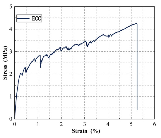 The uniaxial tensile test was conducted according to the Chinese standard JC/T 2461-2018 [20]. The stress–strain curve of the ECC material obtained from the uniaxial tensile test is shown in Figure 1. As shown from the graph, the ECC that was prepared with the test mix design has obvious strain hardening characteristics, with an ultimate strain exceeding 5%, and a tensile strength exceeding 4 MPa.