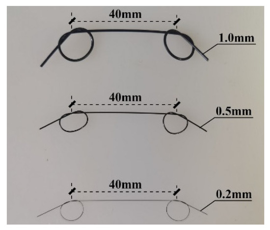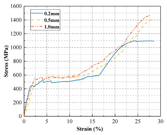 The raw material used in the experiment to produce SMA fibers is SMA wire, which was produced by Jiangyin Renchang Nickel Titanium New Material Co., Ltd. (Jiangyin, China) with a density of 6.49 g·cm–3. The chemical composition of the SMA wire is primarily composed of 55.86% Ni and 44.14% Ti. The phase transition temperature of the wire was determined by differential scanning calorimetry (DSC). The austenite start and finish temperatures of the SMA wire were −34.60 °C and −18.19 °C, respectively, indicating that the SMA wire is in the austenite state at room temperature and can exhibit superelasticity. According to Reference [21], uniaxial tensile tests were conducted on SMA wires with diameters of 0.2 mm, 0.5 mm, and 1.0 mm to investigate the tensile mechanical properties of superelastic SMA. The effective tensile length (gage length) of the SMA wires was 100 ± 1 mm, and the loading rate was 2 mm/min. The stress–strain curves at room temperature for the three diameters of SMA wire showed that they all exhibited a stress-induced martensitic phase transition at an applied strain of about 2%, resulting in an obvious strain plateau (Figure 2).