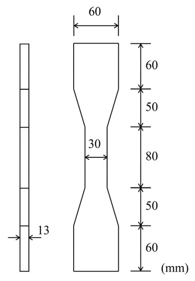 The tensile mechanical properties and influencing factors of SMA/PVA-ECC composite materials were studied using uniaxial tensile tests. Dog-bone-shaped specimens were designed for the tensile tests, and their dimensions are shown in Figure 3. ECC materials were prepared using the mixing ratio in Table 1. To analyze the effects of SMA fiber diameter and content on the tensile properties of SMA/PVA-ECC composite materials, three types of SMA fibers with diameters of 0.2 mm, 0.5 mm and 1.0 mm were selected, as well as three types of SMA fiber contents, which were 0.2%, 0.3% and 0.4%, SMA fiber content was controlled by weighing with an error kept within ±0.1 g. Tensile specimens were designed and fabricated in nine groups of three specimens each, as shown in Table 2. SMA fibers were designed with knotted ends, and the length between the knotted ends was controlled at 40 mm. Figure 4 shows the design of the SMA fiber ends.