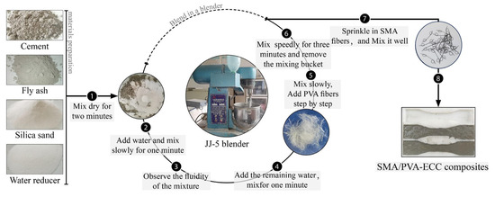The powder materials (cement, fly ash, quartz sand, and the water-reducing agent) were poured into a JJ-5 type cement mortar mixer and dry mixed for two minutes until they were evenly dispersed. Approximately half of the required amount of water was added, and the mixture was stirred at a low speed for one minute. When the ingredients were completely mixed, the remaining water was added and stirred for another minute. PVA fibers were then added to the mixture, before removing the mixing bucket; the mixture was stirred at high speed for three minutes. Subsequently, batches of SMA fibers were sprinkled into the mixture and evenly stirred. Finally, the mixture was poured into the specimen molds to obtain the SMA/PVA-ECC composite material mixture. In the fabrication process, the main point was to ensure that the SMA fibers were uniformly distributed in the axial tensile direction of the specimen. After 24 h, the molds were removed, and the specimens were placed in a standard curing box with a temperature of 20 ± 2 °C and a relative humidity of over 95% for 28 days. Figure 5 shows the detailed production process of the dog-bone-shaped tensile specimens.