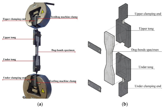 As shown in Figure 6a, the uniaxial tensile test was conducted using a WD-PD6305 universal testing machine. In order to avoid stress concentration caused by direct contact between the specimen and the fixture, and to prevent eccentric tensile loading, the authors designed and fabricated a special tensile fixture to fix the dog-bone shaped specimen. The tensile fixture consists of upper and lower clamping ends, and upper and lower fixtures. To ensure a stable connection between the upper and lower clamping ends and the testing machine, the surface of the upper and lower clamping ends was subjected to 45° inclined scratching and polishing treatment. The schematic diagram of the tensile fixture is shown in Figure 6b. The test was conducted using displacement-controlled loading at a loading rate of 0.5 mm/min, and both the load and displacement were automatically recorded by the testing machine. The stress and strain were calculated based on the actual dimensions of the specimen. The loading was stopped when a clear main crack appeared on the specimen, and strain softening occurred.