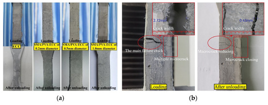 Figure 7a presents the failure modes of ECC and SMA/PVA-ECC specimens during the loading and unloading process. All specimens exhibited distinct multiple cracking phenomena during the loading phase. From the crack development during loading, it can be observed that, initially, no cracks appeared on the surface of the specimen matrix, and the stress–strain curve exhibited almost linear growth. As loading continued, microcracks [22] gradually propagated from both ends of the specimen towards the center until saturation, with the width of the microcracks remaining relatively constant and did not exceed 30μm. Ultimately, significant main cracks appeared in the middle of the specimen, leading to failure. During the failure phase, ECC specimens exhibited wider main cracks, which were unable to close effectively upon unloading. In contrast, SMA/PVA-ECC specimens demonstrated effective closure of both the main cracks and adjacent microcracks upon unloading. As an example, the comparison of cracks in SMA/PVA-ECC specimens during loading and after unloading was demonstrated using specimen S-0.5-0.2, as shown in Figure 7b. Taking specimens with a fiber content of 0.2% as an example for comparison (Table 3), it can be observed that specimens with different SMA fiber diameters had an average main crack width ranging from 2.44 mm to 3.14 mm during the failure phase, while the average residual crack width after unloading was only 0.34 mm to 0.47 mm, indicating a significant crack self-closing capability of SMA/PVA-ECC specimens. This is attributed to the sufficient anchoring performance of SMA fibers with knotted ends and ECC, as well as the effective utilization of the superelasticity of SMA fibers. Upon unloading, the SMA fibers generate recovery forces, effectively closing the cracks in the ECC matrix.