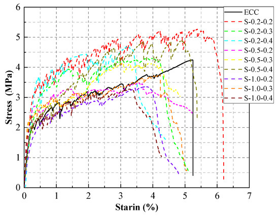 In comparing the stress–strain curves of representative specimens in each group, it can be observed from Figure 8 that both ECC and SMA/PVA-ECC exhibit a three-stage development process with significant strain hardening characteristics. The curves showed multiple small fluctuations, indicating the presence of significant multiple cracking characteristics in the specimens. The comparison reveals that, compared to ECC specimens containing only PVA fibers, SMA/PVA-ECC specimens containing hybrid fibers exhibit a significant increase in initial cracking strength, and some hybrid fiber specimens show improved ultimate tensile stress. After reaching peak stress, the stress degradation of SMA/PVA-ECC is slower than that of ECC specimens, indicating that even after the PVA fibers are completely pulled or extracted, the SMA fibers can still bear loads under the anchoring effect of the knotted end, slowing down the rate of stress degradation. However, the ultimate strain of the SMA/PVA-ECC specimens is relatively lower than that of ECC specimens, with only a few hybrid fiber specimens exhibiting higher strain capacity than the ECC specimens.